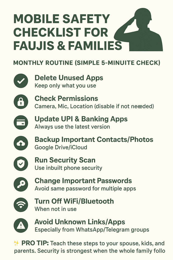 In today’s world, our mobile phones are like our lifeline — whether it’s for staying in touch with family, making UPI payments, or keeping up with news and entertainment. For Faujis and their families, mobile safety is not just about avoiding fraud; it’s also about protecting personal and professional privacy.